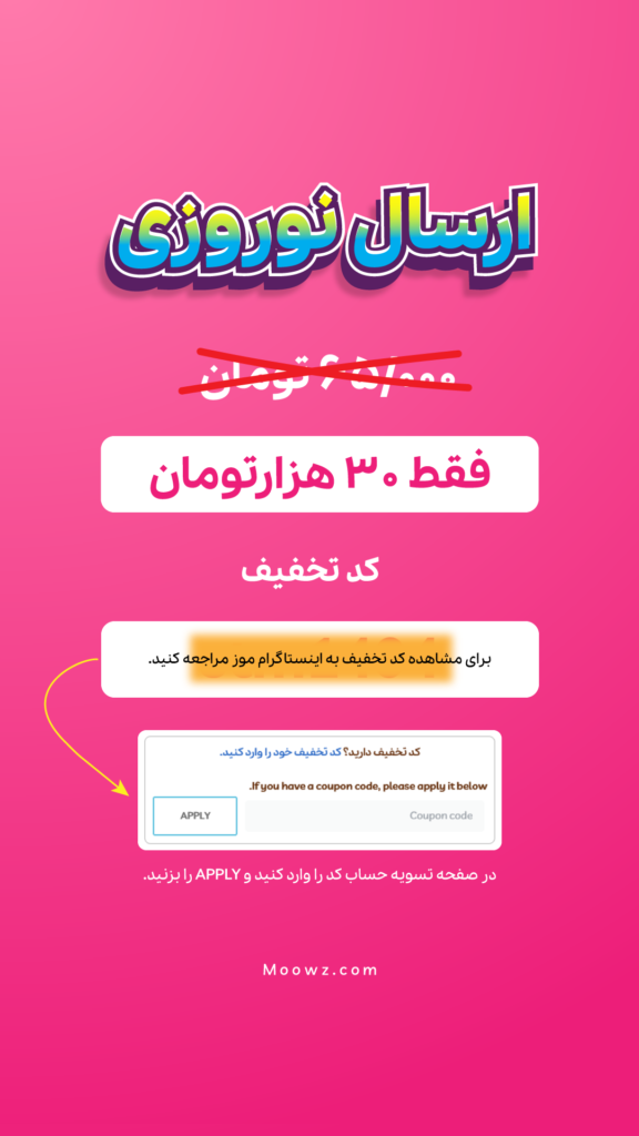 جهت دریافت این کد تخفیف فقط کافیه وارد اینستاگرام موز بشید و استوری رو مشاهده کنید و در جای گفته شده در صفحه تسویه حساب کد تخفیف رو وارد کنید.