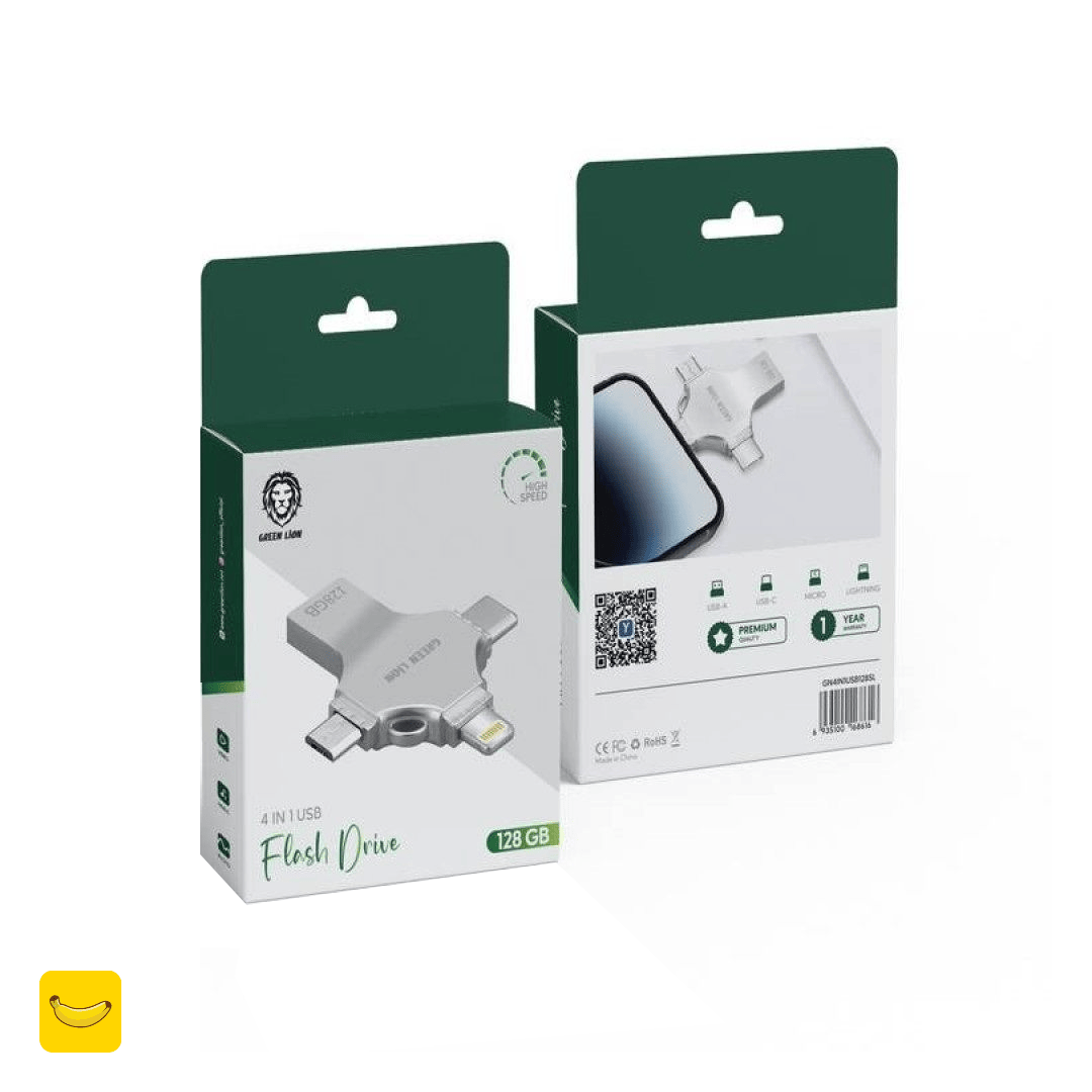 فلش مموری Green Lion 4 in 1 USB 128GB یک حافظهی پرسرعت و کاربردی است که با چهار نوع درگاه مختلف (USB‑A، USB‑C، Lightning و Micro USB) طراحی شده تا بدون نیاز به مبدل، فایلها و دادههای خود را بین گوشی، لپتاپ، تبلت و دوربین بهراحتی جابهجا کنید.